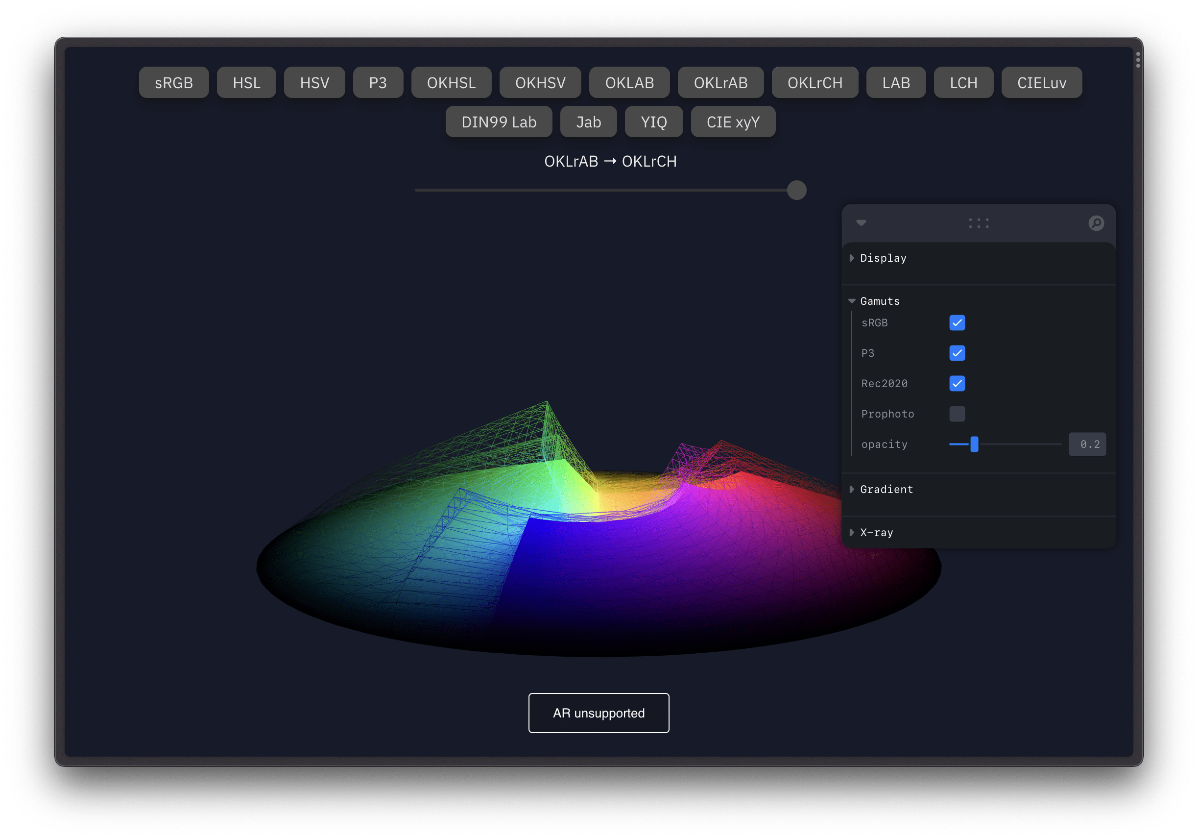 In fact I believed: HSL is properly used right here, however what concerning the HDR coloration codecs?! Looks as if a superb alternative to arrange P3 colours and non-P3 coloration fallbacks. I don’t assume this truth is misplaced on Alexey, as they’ve tons extra coloration experiments they’ve constructed. For instance, this visualizer for taking a look at coloration fashions, which then it appears to be like like acquired an improve to visualise extra fashions (and gamuts).
