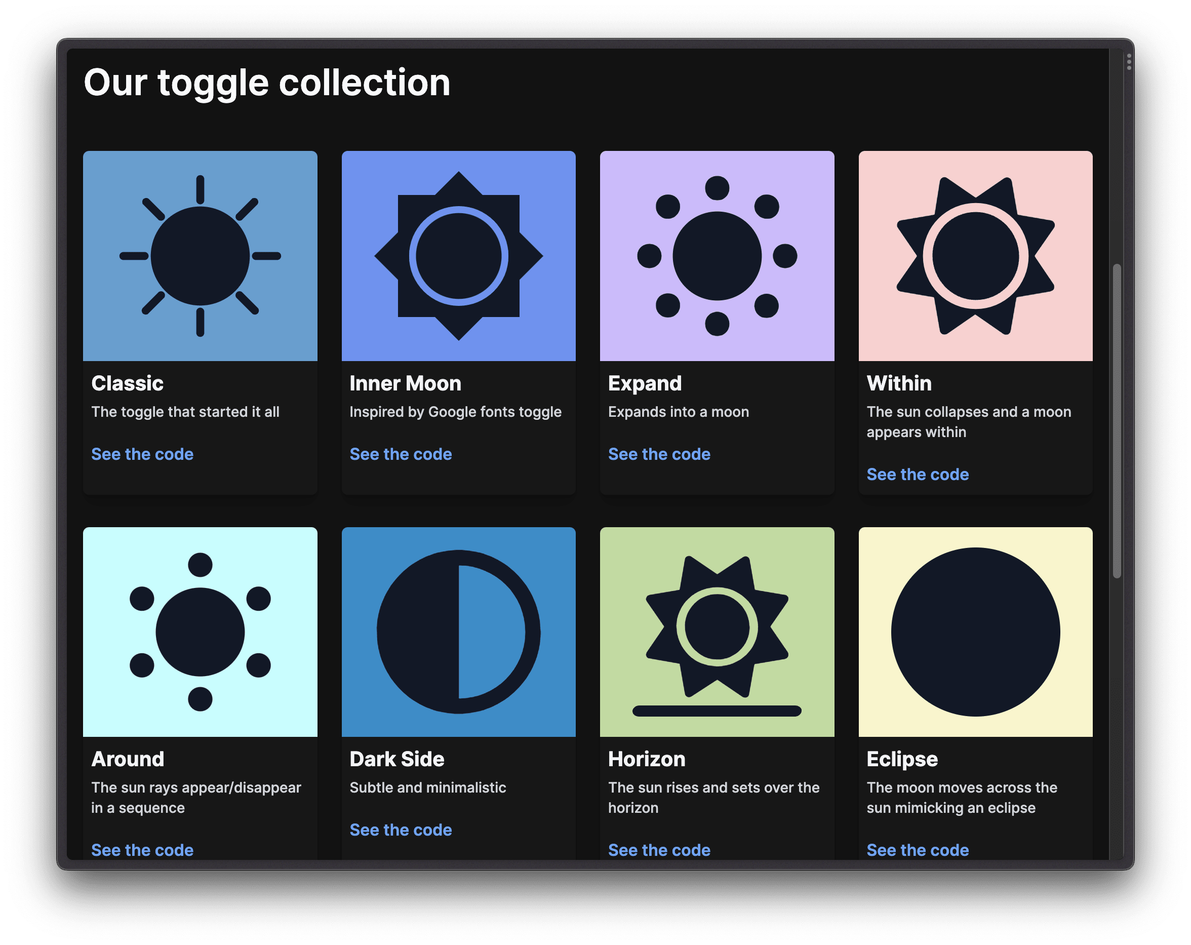 Want a neat little animated toggle for Mild Mode / Darkish Mode? This website has a complete bunch of them: