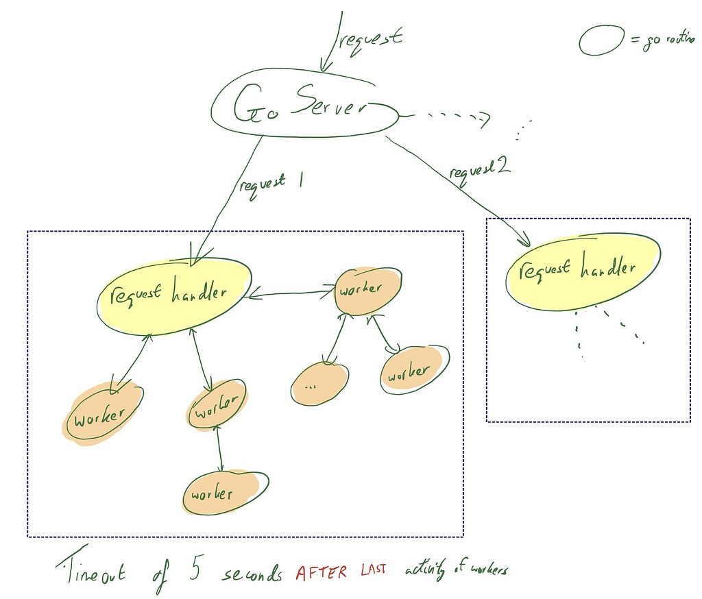 Think about the state of affairs the place you could have a server that handler requests through a request handler (check with image). The handler (through its employees) can take a very long time, so that you want a timeout simply in case it by no means terminates. Requests that take a very long time are acceptable in our case, so long as any one of many employees is progressing. Nonetheless, the preliminary timeout that we set limits this. (I.e. is there a strategy to detect inactivity as an alternative of a relentless timeout?)