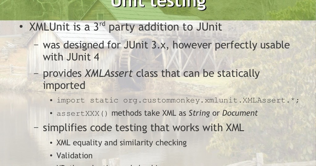 XMLUnit library will also be used as JUnit by extending XMLTestCase class, which gives strategies like assertXMLEqual(org.w3c.dom.Doc supply, org.w3c.dom.Doc goal) and several other different overloaded variations for testing XML recordsdata. You may verify if an XPath exists or not and whether or not it accommodates the anticipated worth or not. It is an excellent software to write down automated checks in case your program is producing or modifying XML recordsdata.