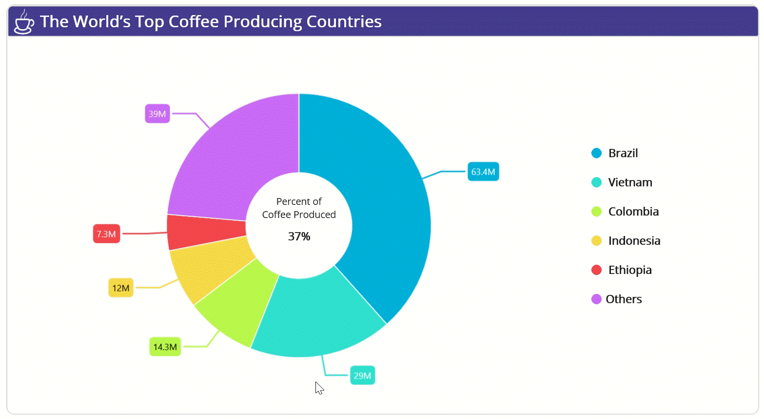 Earlier than making a chart, we have to collect the information on espresso manufacturing from the Worldwide Espresso Group. For this demonstration, we get hold of knowledge on the international locations concerned, manufacturing quantity in hundreds of thousands, and market share percentages. It can save you the information in CSV format.